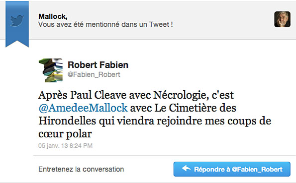 Le « Tweet » d’un libraire ! Auteur/autrice de la publication :Mallock officiel Post published:7 janvier 2013 Post category:Blog / Romans Un grand merci Ă lui đ Merci pour les partages ! Partager ce contenu Ouvrir dans une autre fenĂȘtre Ouvrir dans une autre fenĂȘtre Ouvrir dans une autre fenĂȘtre Vous devriez Ă©galement aimer Premier amour⊠8 juin 2019 On nous aurait menti ? La terrible vĂ©ritĂ© sur les vidĂ©os de chats :-( 25 dĂ©cembre 2011 Portrait du Commissaire extrait de la prochaine chronique 23 aoĂ»t 2019