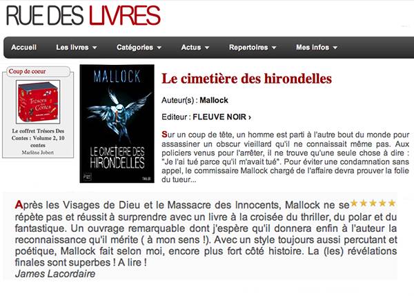 Le premier thriller « littéraire » ! Polar, percutant, glaçant et flamboyant, » le Cimetière des Hirondelles » réveille les ronrons des sorties habituelles ! L’écriture de ce livre policier est surprenante. Tout à la fois enlevée et poétique, violente et tendre, elle prend le lecteur aux tripes et au cœur ! Le scénario est diabolique et Mallock, incroyable commissaire Mallock avec ses visions et sa mélancolie, plus qu’attachant. Un seul problème majeur, après avoir quitté Mallock, vous vous sentirez en manque. Vous avez dit, le meilleur polar de l’année ? Nathalie Szapiro